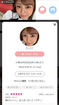 PCで見たとき、スマホで見たときの女の子のプロフィール画面ですが、プロフィール画面も非常に充実しています。