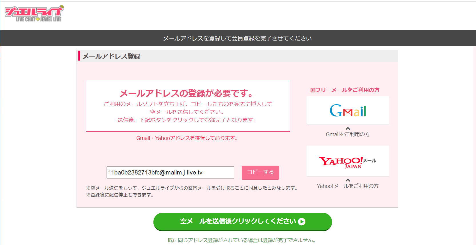 GmailまたはYahoo!メールで登録する場合は、画面右側の該当ボタンをクリックすればメール送信画面が表示されます。