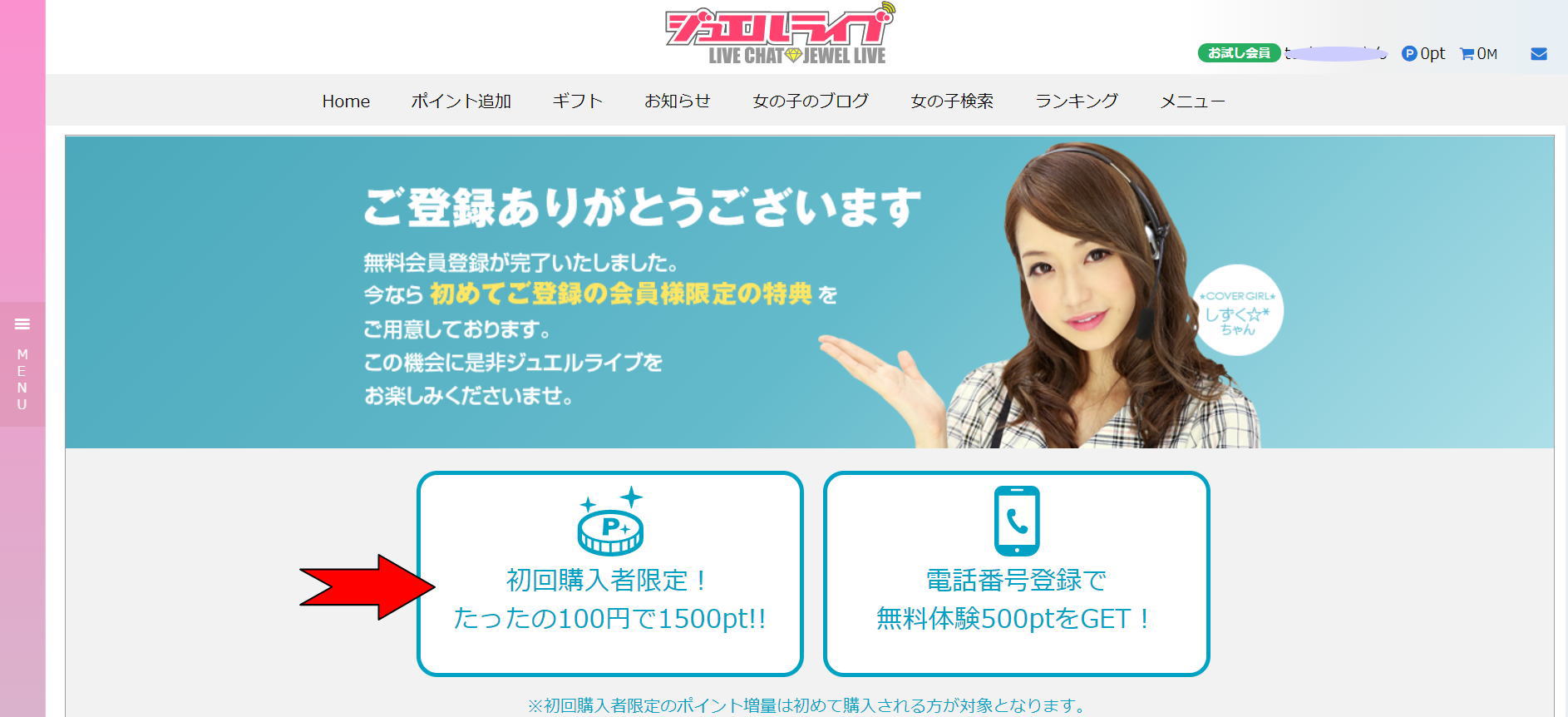 「初回購入者限定!たったの100円で1500pt!」