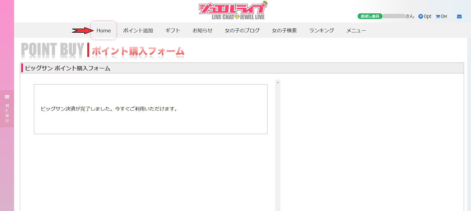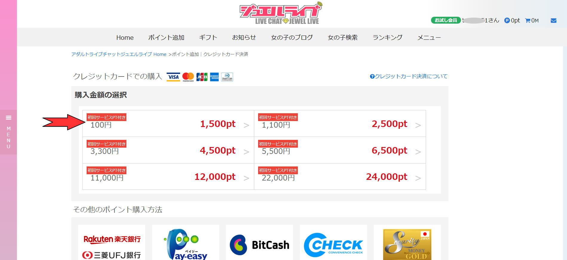 お試しで100円でサービスポイントの1500ptだけを貰う場合は矢印のところをクリックします。