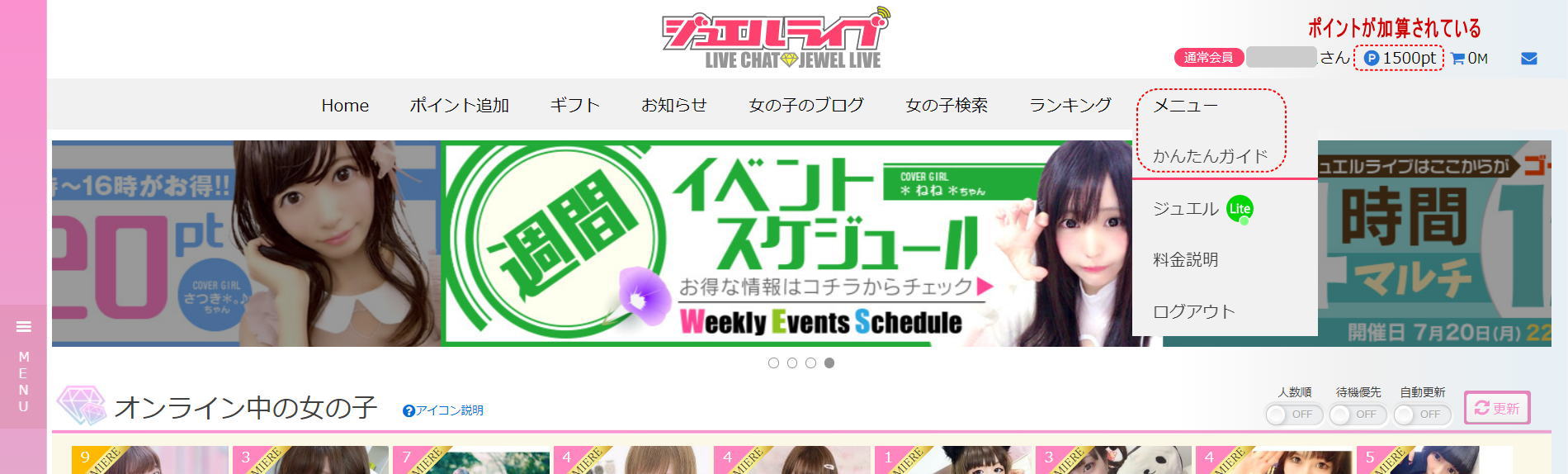 女の子がたくさん並んだページに変わりますが、画面右上ポイントが加算されているのが確認できます。
